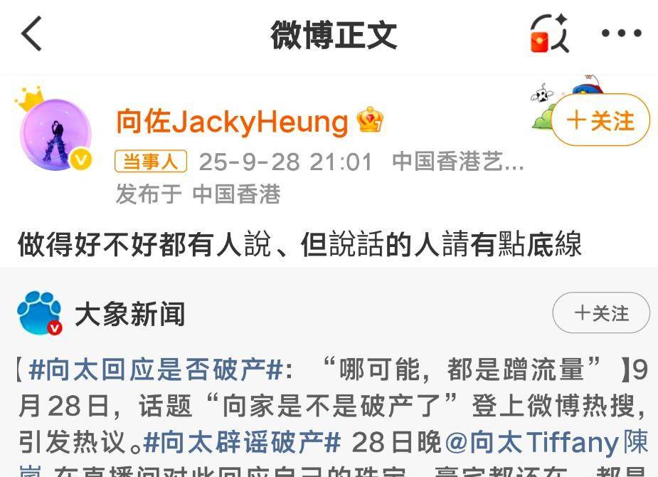 在媒体报道向太辟谣的消息后,向佐也转发了相关新闻。他虽未直接回应破产传闻,但公开批评造谣者毫无底线,并写道:“无论做得多好都有人议论,但说话的人请守住基本底线。”