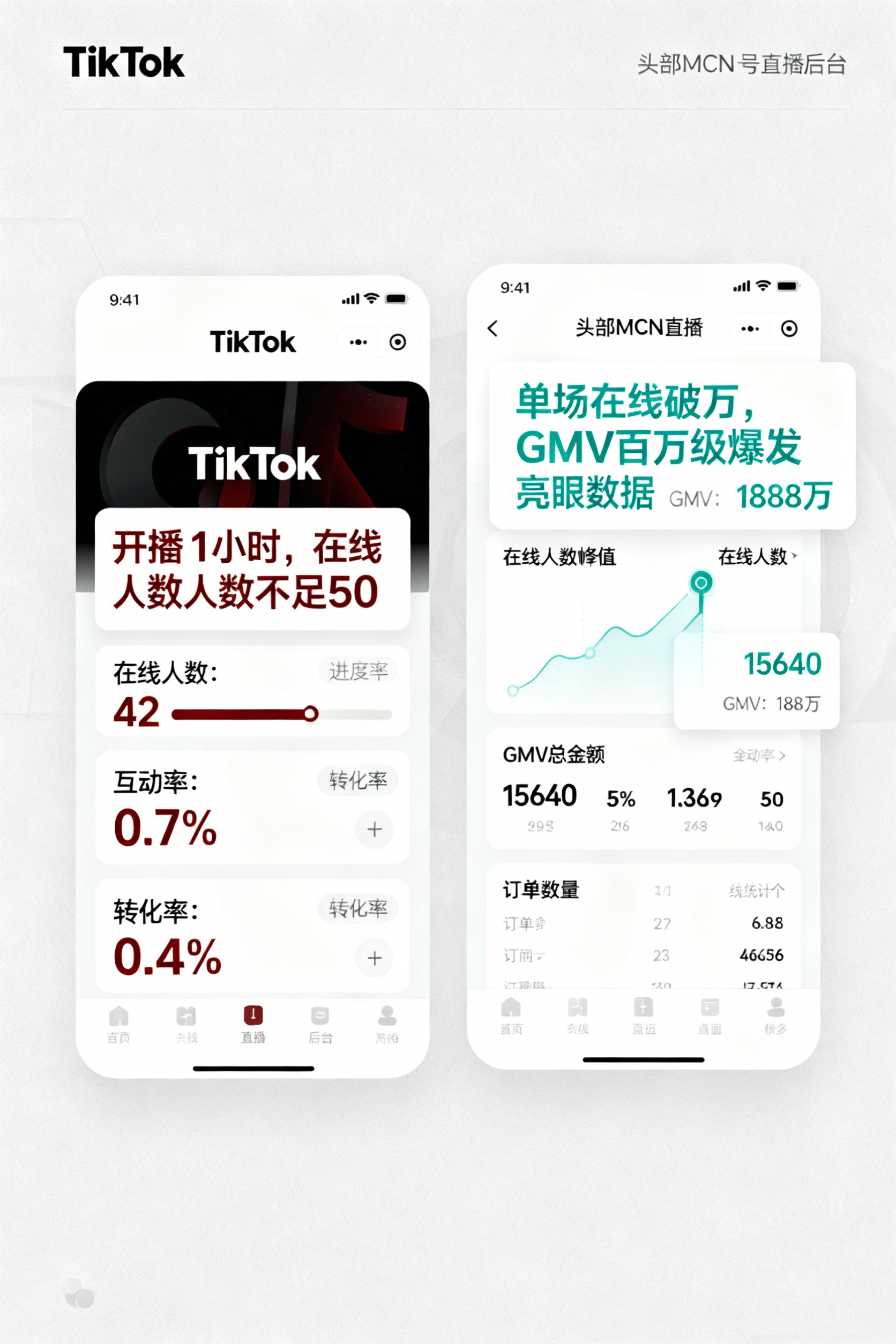 转粉率(目标设定为2%),每周迭代1个运营细节。这套流程让账号单月GMV突破12万美元,流量利用效率提升40%。核心逻辑:TikTok直播流量分配,与前5分钟互动率、预约量等数据强相关。MCN的精细化运营,就是通过全流程把控这些关键节点,让平台算法持续推送流量。